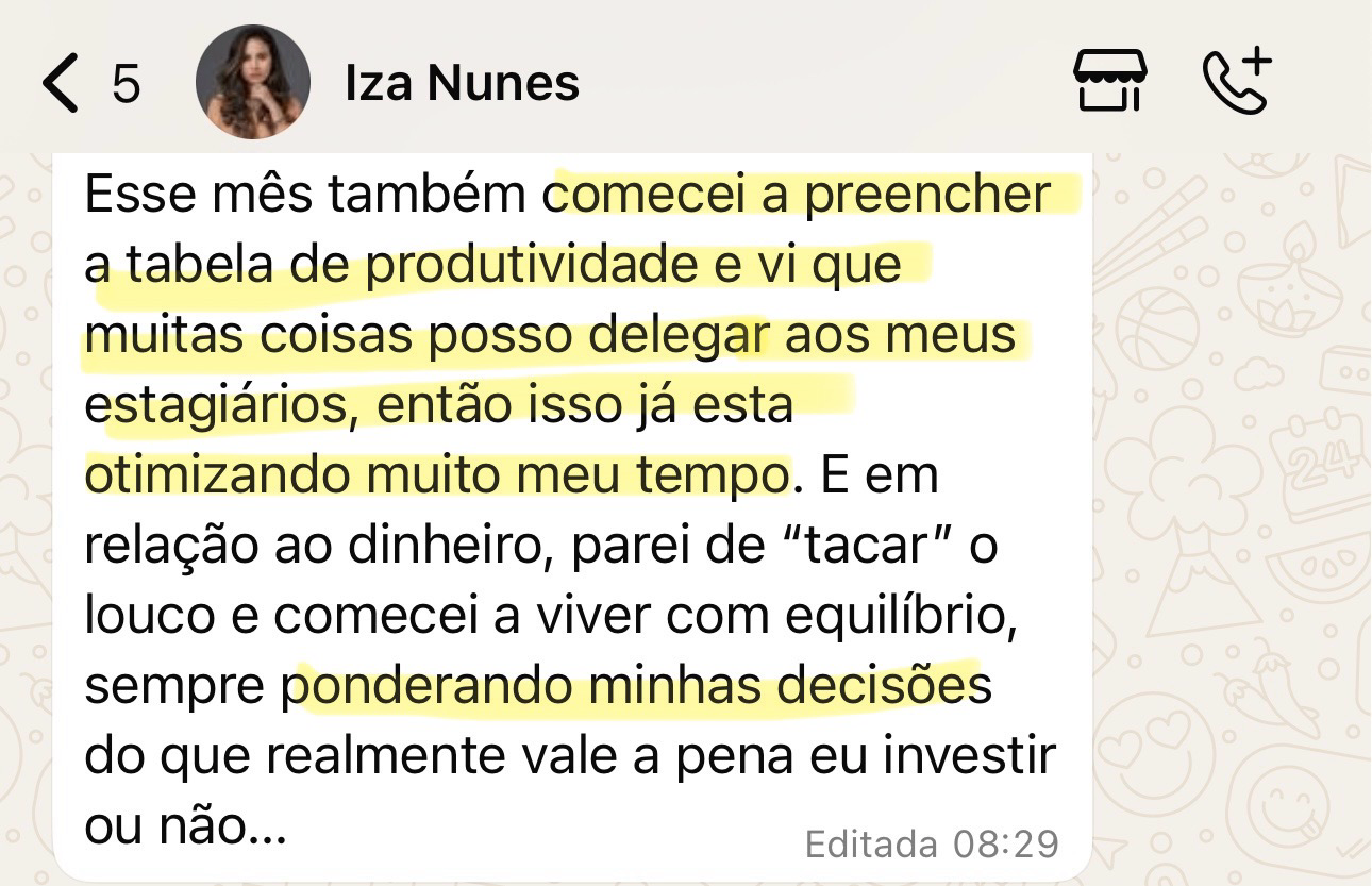 “Comecei a preencher a tabela de produtividade… otimizou muito meu tempo. Agora pondero minhas decisões com equilíbrio.”