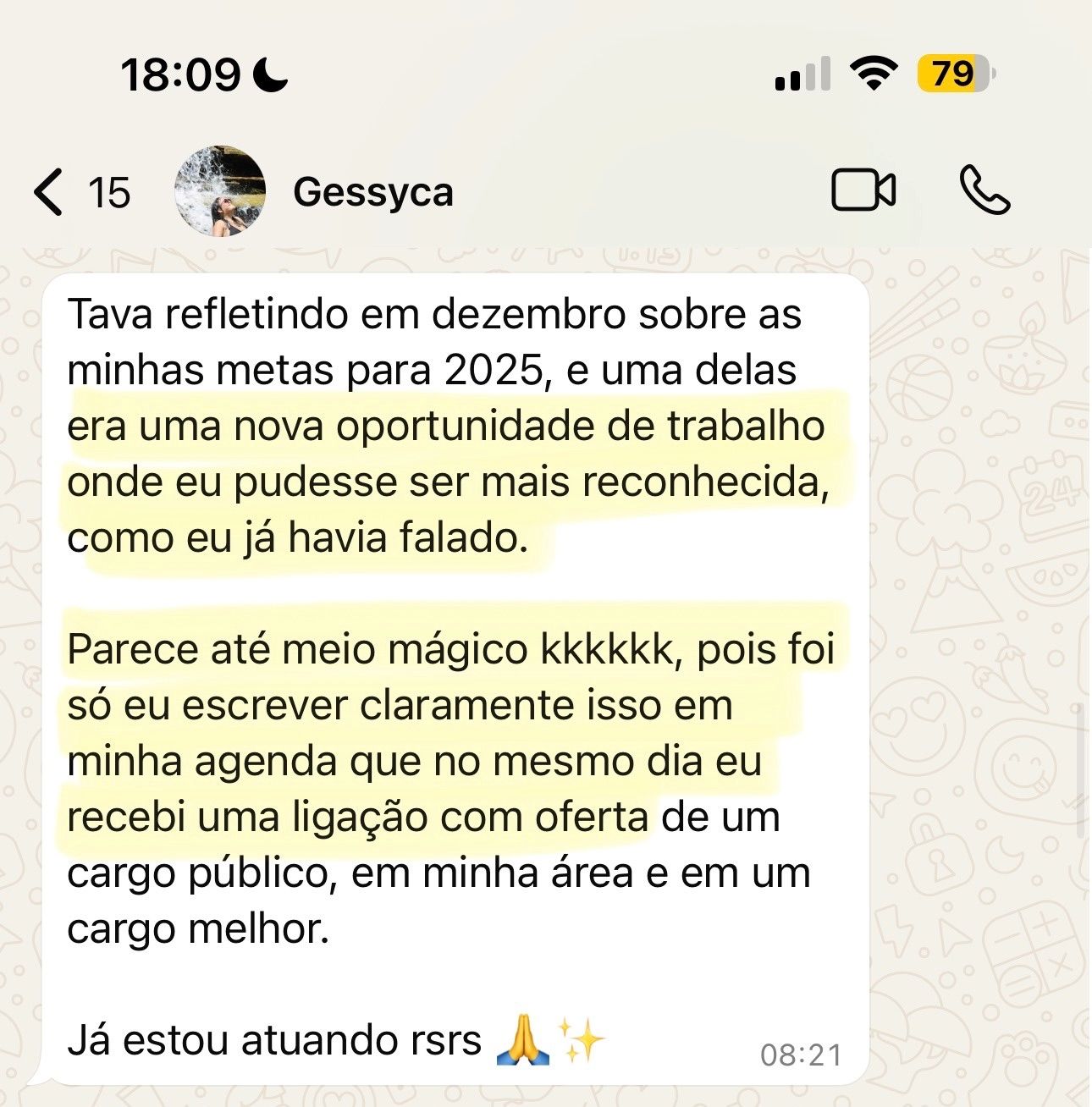 “Parece até meio mágico pois foi só eu escrever isso em minha agenda que no mesmo dia eu recebi a ligação com a nova oportunidade de trabalho”